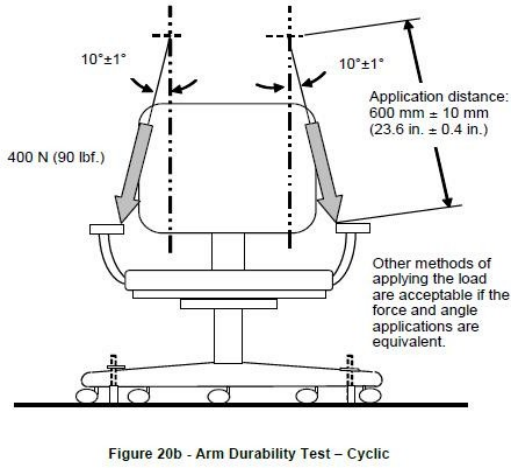 Simultaneously apply a force of 400 N (90 lbf.) to each arm initially at a 10 degrees ± 1 degree angle as shown in Figure 20b. The arm loading device must follow the arm (allow fore and aft, side-to-side and rotational movement) as it deflects or pivots. If using a test device similar to that shown in Figure 20b, the load application distance must initially be the length specified in the figure. Other methods of applying the load are acceptable if the force and angle applications are equivalent. The force shall be applied and removed for 60,000 cycles at a rate between 10 and 30 cycles per minute.